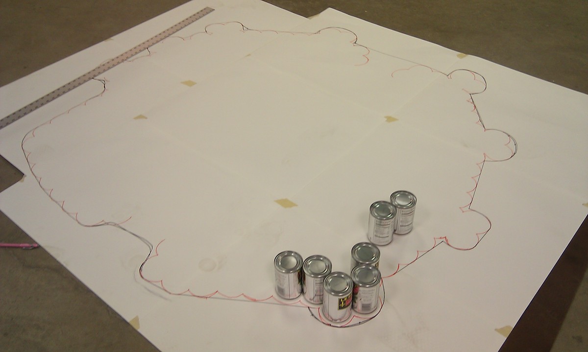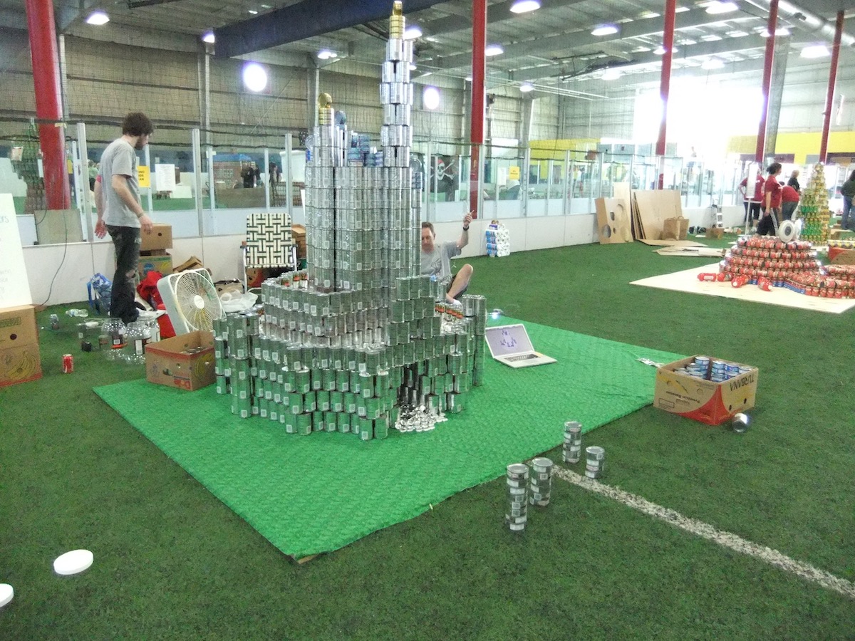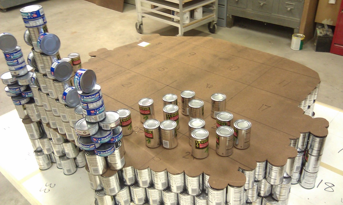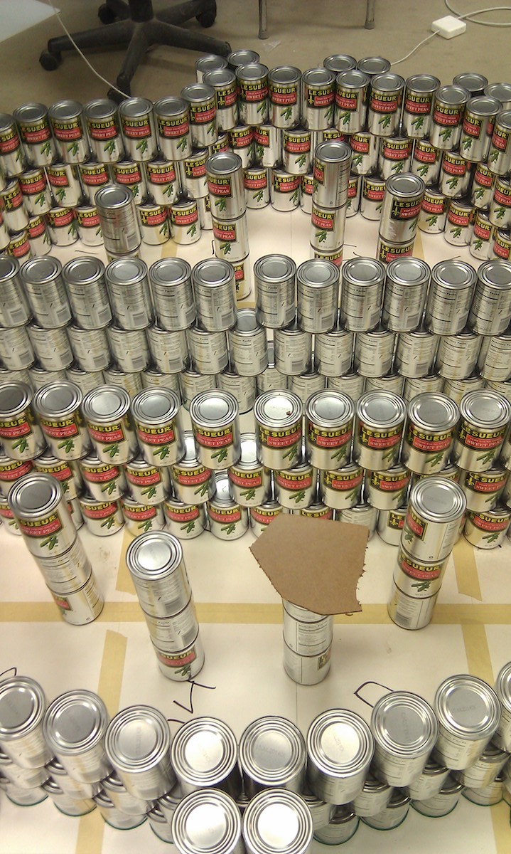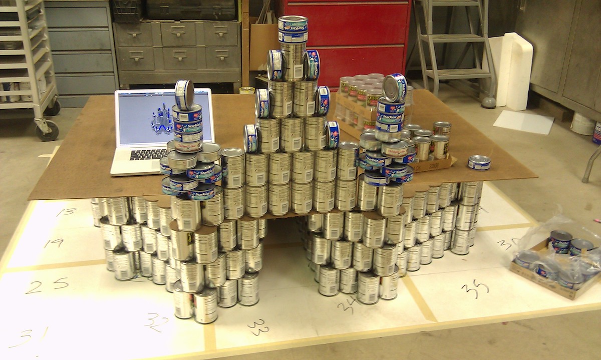 Using the pictures of the cans and the grid from back in the shop, we started stacking cans.