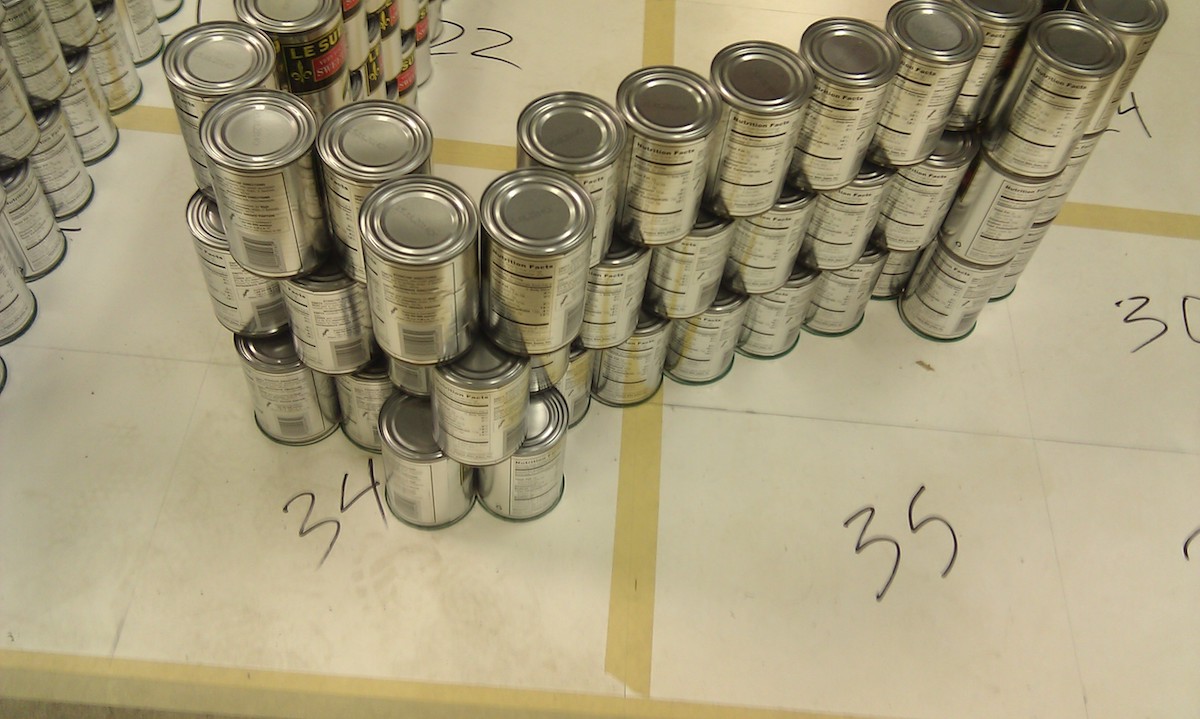 After we stacked the first three layers of cans, we wrote a number on each piece of paper.