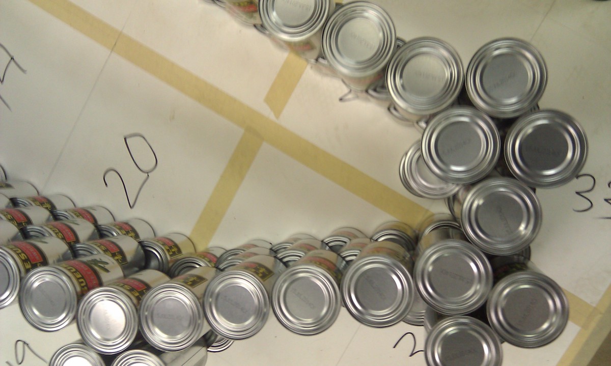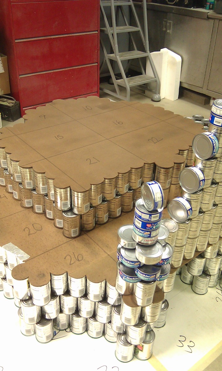 After two new layers of cans, another sheet of particleboard went up with the grid marked on it.